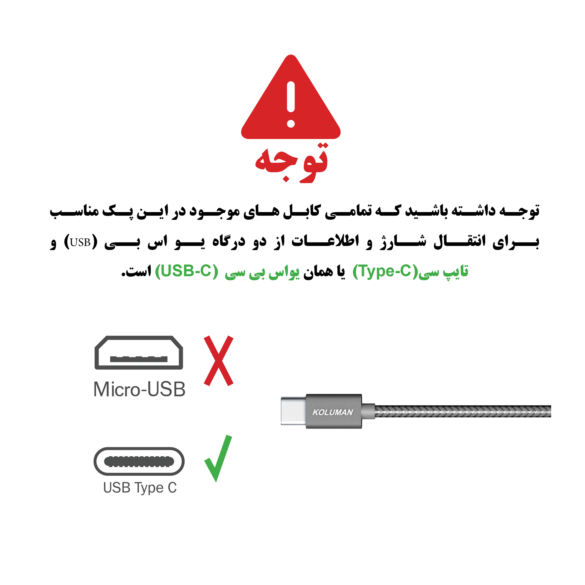 توجه داشته باشید که تمامی کابل های موجود در این پک مناسب برای انتقال شارژ و اطلاعات از دو درگاه یو اس بی (USB) و تایپ سی (Type-C) یا همان یواس بی سی (USB-C) است. کانکتور Type-C در این محصول با انواع گوشیهای موبایل و دستگاههای مجهز به درگاه Type-C سازگاری خواهد داشت. همچنین کانکتور USB در آن با کامپیوتر، لپتاپ، شارژرهای دیواری، پاور بانک و دیگر دستگاههای دارای این درگاه سازگار است.