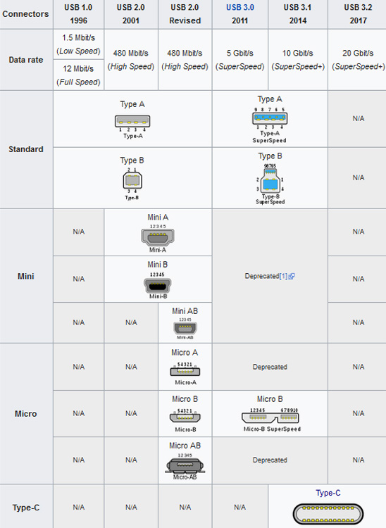 کابل USB 3.0 در سه استاندارد A و B و Micro-B وجود دارد. نسل سوم USB آخرین استانداردی است که سرعت انتقال داده بیشتری ارائه میکند و با نسخههای قبل از خود سازگار است. اتصالهای استاندارد نوع A مشابه اتصالات نوع A نسخههای قبلی هستند اما رنگ داخل درگاه و رابط آنها آبی است و بهخوبی با استانداردهای پیشین سازگار است. در این نسل انتقال اطلاعات سریعتر (تا 5 گیگابیت در ثانیه) وقتی عملی خواهد بود که هر دو دستگاه کابل USB 3.0 را پشتیبانی کنند. در تصاویر زیر، دو تصویر سمت چپ مربوط به استاندارد A، دو تصویر وسط استاندارد B و دو تصویر سمت راست مربوط به کابل Micro B هستند.
