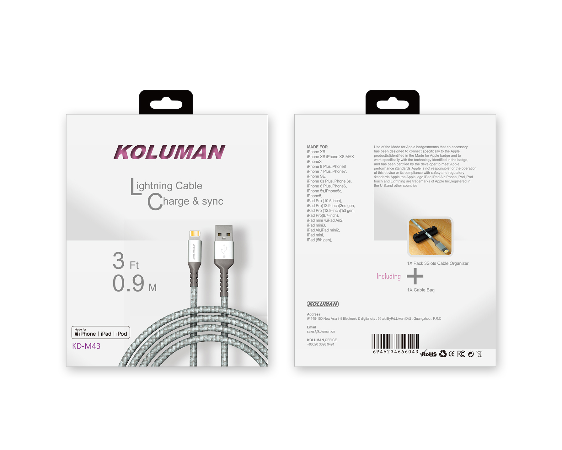برند «کلومن» (Koluman) اینبار اقدام به تولید کابل های لایتنینگ با استاندارد های MFi کرده است.کابل KD-M43 از برند کلومن با استفاده از استانداردهای MFI ساخته شده و در زمان استفاده از آن هیچ خطری دستگاههای شما را تهدید نخواهد کرد. این محصول شرکت کلومن توانسته استاندارد MFi شرکت اپل را کسب کند. این استاندارد که مخفف عبارت «ساختهشده برای آیفون، آیپد و آیپاد» (Made For iPhone, iPad, iPod) است، نشاندهندهی این است که شرکت اپل کابل را بهعنوان محصولی مناسب و قابلاطمینان به رسمیت شناخته است. ای بدین معنی می باشد که سری لایتنینگ این کابل با کابل اصلی درون جعبه هیچ تفاوتی ندارد فقط از نظر طول و ظاهر با کابل اصلی متفاوت است.
