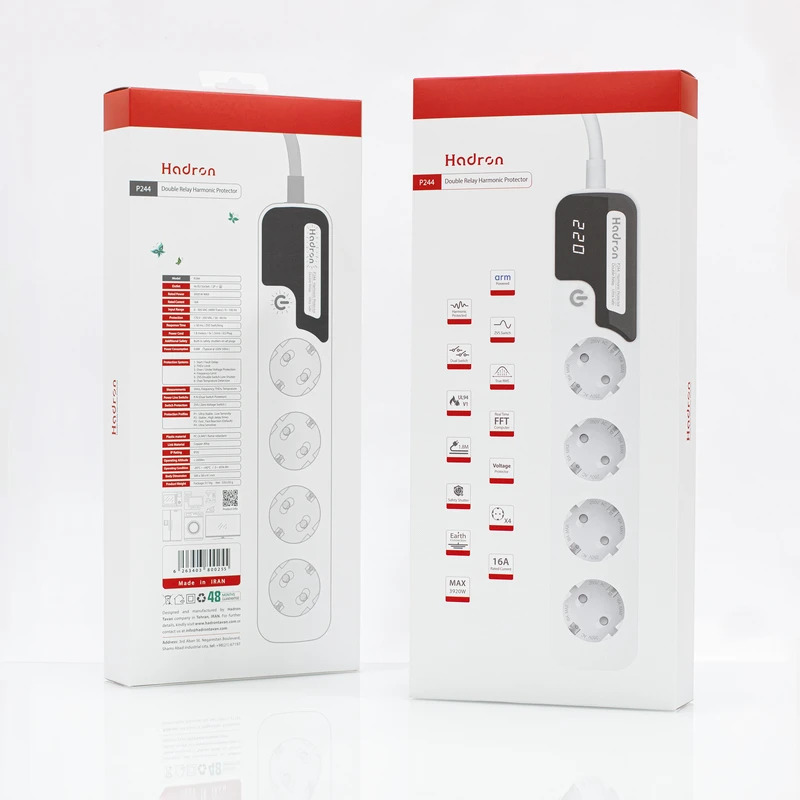 محصول P244 چندراهی برق و محافظ هارمونیک دو رله هادرون، دستگاهی به منظور محافظت از لوازم و تجهیزات الکتریکی در برابر شرایط نامطلوب برق شهری است که از لوازم برقی در برابر افزایش ناگهانی هارمونیکهای مخرب، تغییرات ولتاژ و نوسانات فرکانس محافظت میکند. نمایشگر این محصول، امکان نظارت بر عملکرد دستگاه و همچنین مشاهده پارامترهای الکتریکی اندازهگیری شده از برق ورودی را فراهم میآورد. این دستگاه دارای چند برنامه محافظتیِ پیشفرض برای کاربردهای متفاوت است. کاربر میتواند متناسب با شرایط استفاده، اقدام به انتخاب برنامه مورد نیاز نماید.