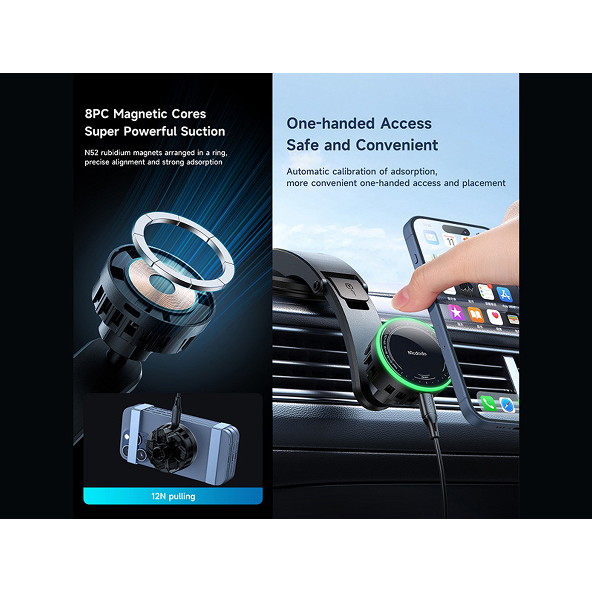 یک درگاه Type c با پشتیبانی از فناوری های شارژ سریع PD, QC به عنوان ورودی امکان اتصال هوادر شارژر وایرلس MCDODO CH-512 به یک شارژر فندکی و تامین انرژی لازم جهت فعال شدن آن فراهم می نماید. یک سیم پیج مغناطیسی با قابلیت تنظیم خودکار توان خروجی در بازه های 15W / 10W / 7.5W / 5W امکان شارژ ایمن انواع گوشی های اندوروید و پشتیبانی از استاندارد Qi و iOS با توان های شارژ مختلف و استاندارد MagSafe را فراهم می نماید.